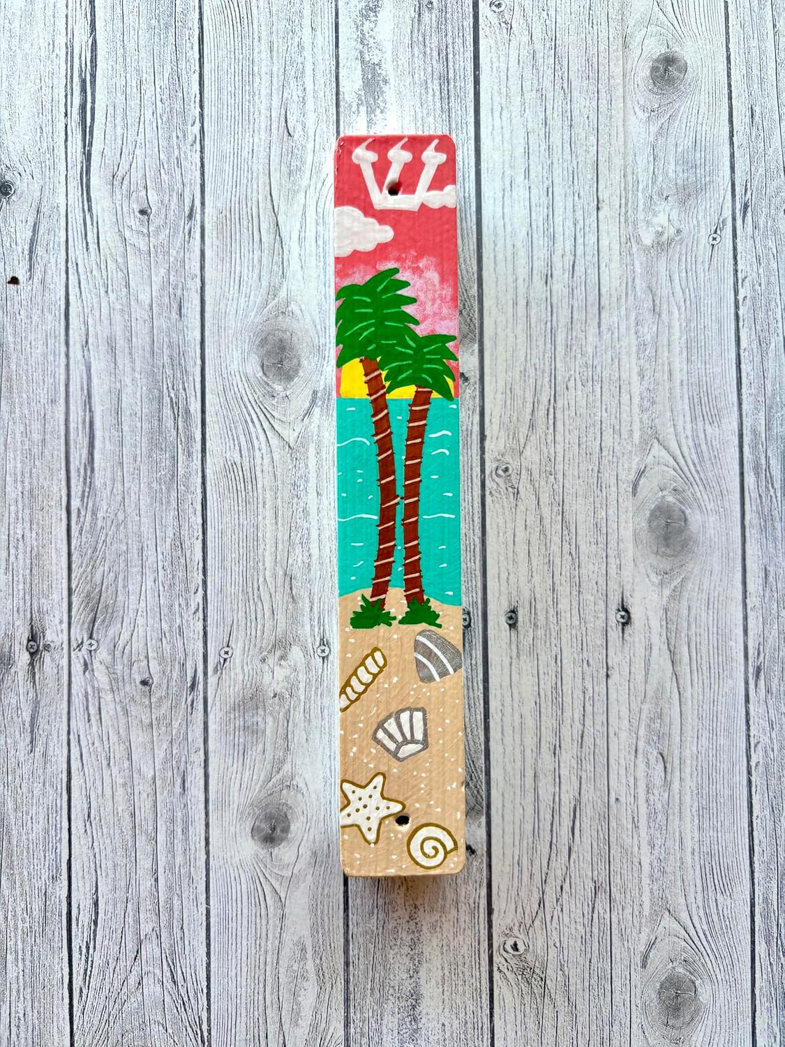 A mezuzah makes a great gift for a new home, bridal shower, wedding, engagement, housewarming, bar/bat mitzvah, or birthday! ► This mezuzah features a beautiful beach scene with sand, seashells and palm trees. ► I hand paint all details with acrylics and seal it with varnish for protection. ► It is made out of a lightweight wood and measures 6” in height. ► The space for the scroll is 4 inches. **NOTE: The mezuzah can be installed with screws through the top and bottom holes or it can be hung with double sided tape (tape included).** As always, please let me know if you have any questions!